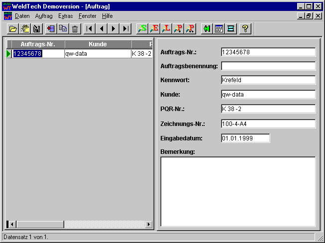 Sollten keine Datensätze angezeigt werden, kehren Sie über Menü - Daten - Suchen oder über die Schaltfläche Suchmodus ändern in den Suchmodus zurück und löschen Ihre Eingabe. Durch erneutes Betätigen der Enter-Taste oder der Schaltfläche Datensätze lesen werden Ihnen jetzt alle Aufträge angezeigt. Suchen Sie sich eine Auftrags-Nr. heraus. Kehren Sie wieder in den Suchmodus zurück, tragen Sie jetzt diese Auftragsnummer ein und versuchen Sie erneut die Daten mittels Enter-Taste oder der Schaltfläche Datensätze lesen Ihre so getroffene Auswahl direkt anzuwählen.