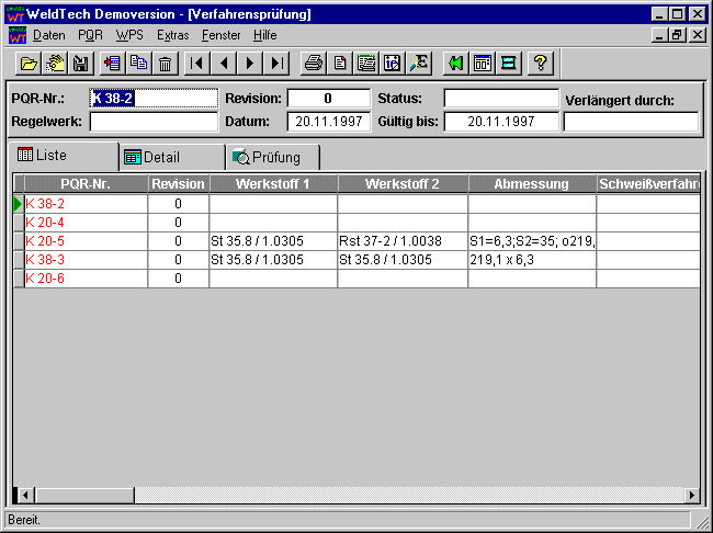 Das in der Demoversion enthaltene Modul dient lediglich der Verwaltung von Verfahrensprüfungen. Zur Erstellung von Dokumentationen zu einer Verfahrensprüfung ist unter WeldTech ein weiteres Modul zuständig. Dieses Modul exportiert die Daten in die wichtigsten Textverarbeitungsprogramme, um sie dort in eine Druckvorlage der Verfahrensprüfung einzufügen. Dieses Modul Erstellen von Verfahrensprüfungen ist nicht Bestandteil der Demoversion.