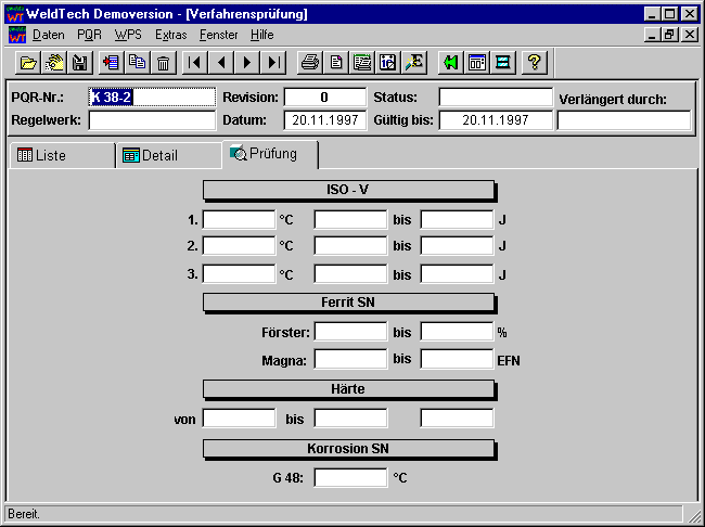 Auf der Arbeitsseite Prüfung werden die Werte der mechanischen