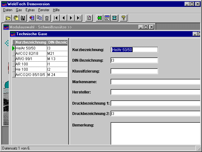 In dieser Datenbank werden alle technischen Gase verwaltet. Es sind Möglichkeiten geschaffen worden, unterschiedlichste Bezeichnungen und Eigenschaften der im eigenen Betrieb verwandten Gase zu erfassen und zu bearbeiten.